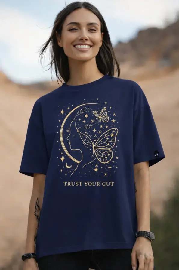 This navy blue oversized t-shirt blends minimal design with a powerful message. With its moon and butterfly artwork and “Trust Your Gut” quote, it’s a perfect choice for women who appreciate aesthetic fashion, self-expression, and effortless everyday style.