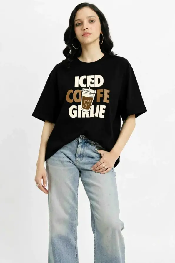 Show off your coffee-loving vibe with this Iced Coffee Girlie Printed Black Oversized T-Shirt. Featuring a trendy coffee graphic and stylish text design, this tee is perfect for casual outings, coffee dates, college wear, and girls who love cute everyday fashion.