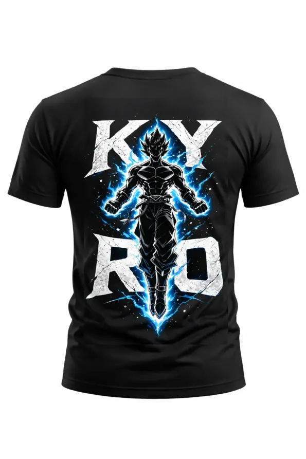 Built for anime fans who love power and attitude, this black graphic t-shirt features a high-energy KYRO design with electric aura effects. A perfect mix of bold style and comfort, ideal for daily wear and standout street looks.