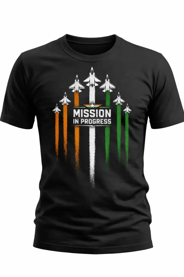 Show your bold and patriotic side with this Mission In Progress Fighter Jet Printed Black T-Shirt for Men. Featuring a powerful fighter jet graphic with tricolor-inspired design, this t-shirt is perfect for casual wear, outings, travel, college, and everyday styling. Easy to pair with jeans, joggers, or shorts for a confident and stylish look.