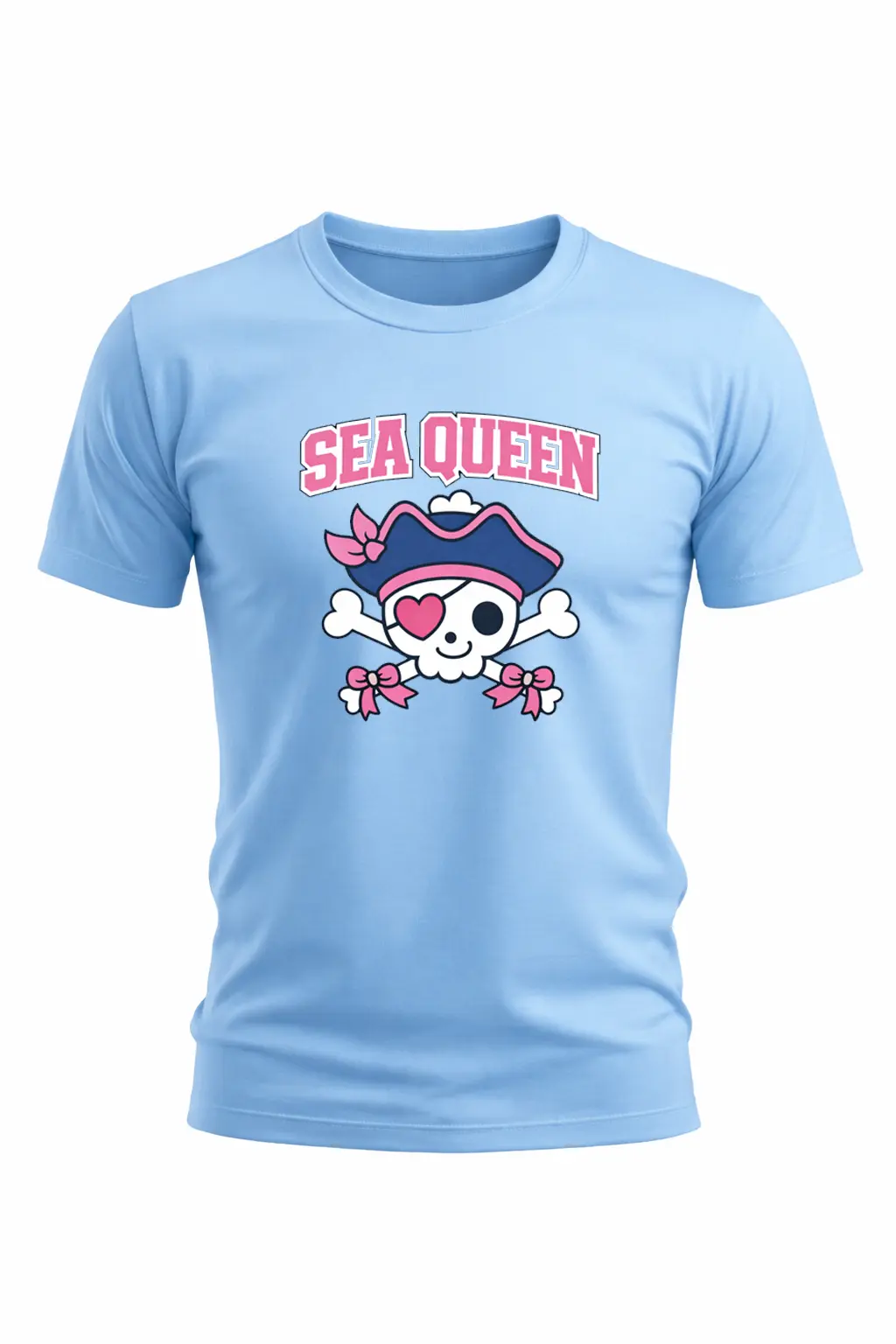 This Sea Queen printed t-shirt brings together cute pirate vibes and fun pastel fashion in one stylish piece. Designed with a playful graphic on a soft sky blue base, it’s perfect for everyday casual wear, gifting, and aesthetic street-style looks.