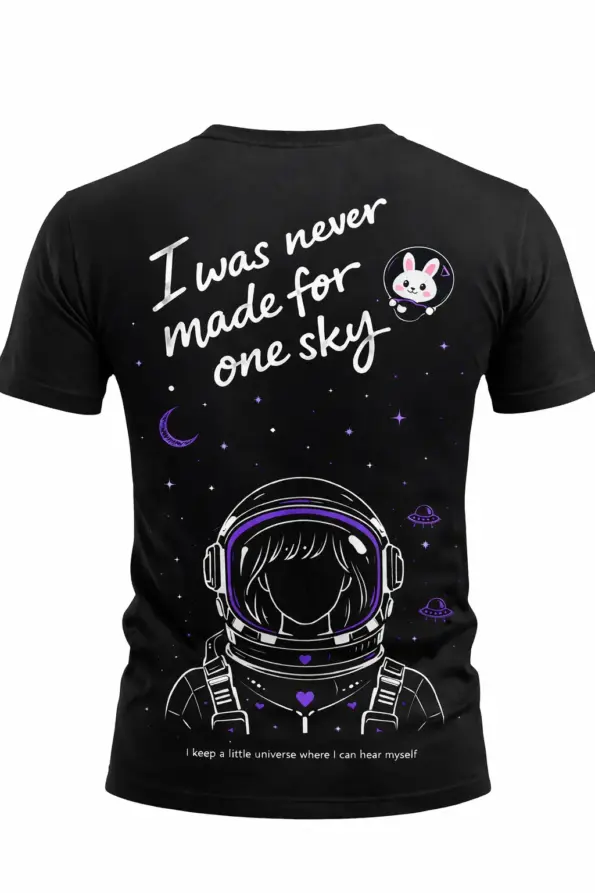 Add a dreamy touch to your everyday style with this Starbound Astronaut Front & Back Printed Black T-Shirt for Women. Featuring a cute space-inspired front print and a bold back design with soft cosmic artwork, this t-shirt blends playful aesthetics, comfort, and streetwear style. Perfect for casual wear, outings, travel, and everyday styling with jeans, cargos, or joggers.