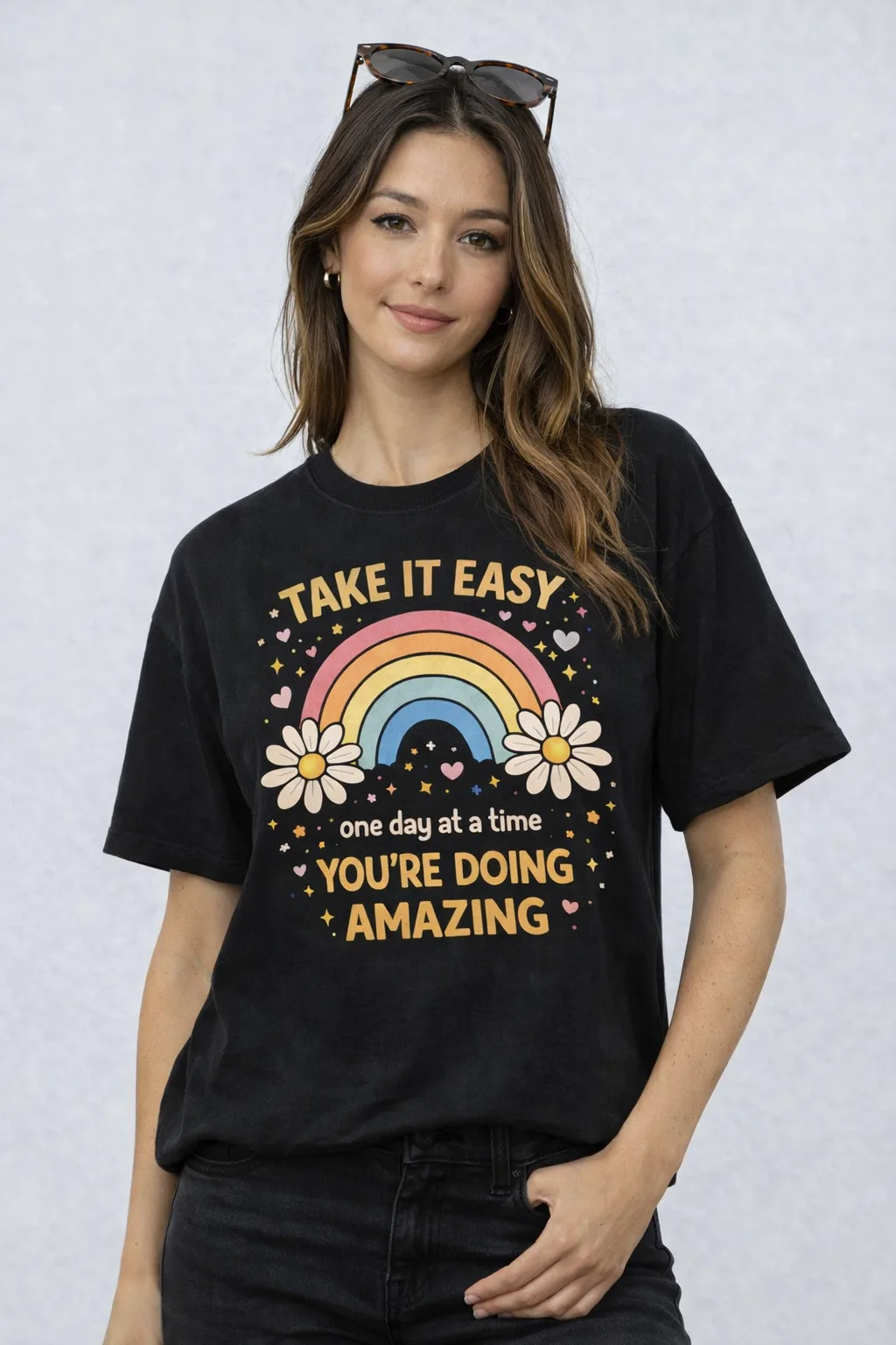 Stay positive and stylish with this “Take It Easy – You’re Doing Amazing” Printed Oversized T-Shirt. Featuring a colorful rainbow graphic and a relaxed fit, this tee is perfect for everyday comfort, casual outings, and uplifting your vibe.