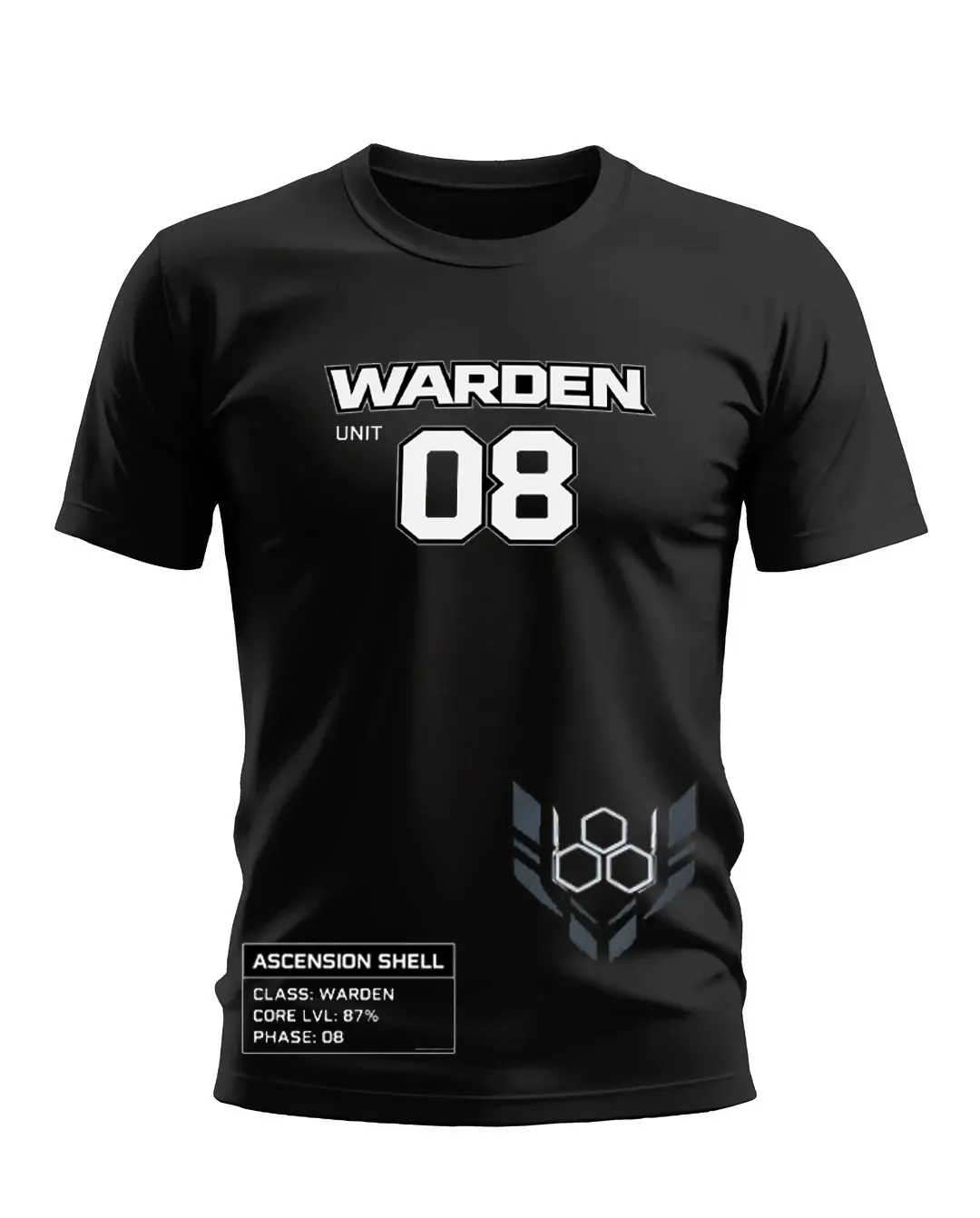 This Warden Unit 08 black graphic t-shirt blends futuristic design with bold streetwear energy. With a clean front layout and statement back print, it is made for those who like powerful style without going over the top.